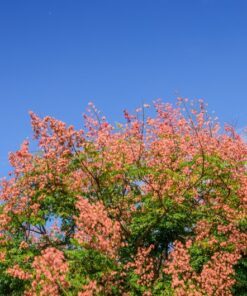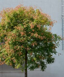 The Dwarf Golden Rain Tree (Koelreuteria Paniculata Nana) is a stunning addition to any garden. Known for its vibrant yellow flowers, this tree also showcases pinkish new foliage and beautiful fall colors. It typically grows between 8 to 12 feet tall, making it a perfect choice for smaller landscapes.