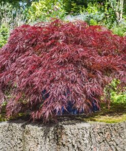 The Inaba Shidare Maple, also known as the Weeping Red Laceleaf Japanese Maple, is a stunning addition to any garden. This variety of Acer Palmatum var. Dissectum showcases dark purple foliage in spring, transitioning to bright red during summer, and finally a fiery crimson red in fall. This striking color change makes it a focal point in any landscape.