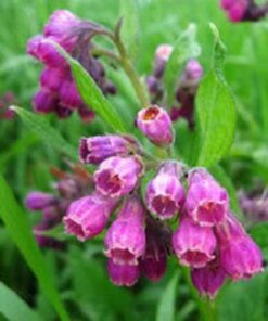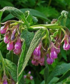 Comfrey grows 24-36 inches tall and prefers average to moist soil, adaptable to heavier soils. It flourishes in full sun to partial shade. The clusters of rosy purple flowers bloom from May to June, attracting beneficial pollinators, making this plant a wildlife-friendly choice for gardens.
