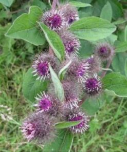 The Burdock (Arctium Lappa) is a versatile herb known for its edible roots and leaves. This plant features stunning blue-violet to fuchsia flowers that thrive in gardens while attracting beneficial insects like bees and butterflies.