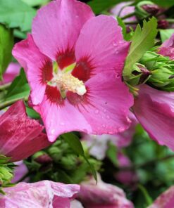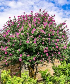 The Dark Pink Rose of Sharon (Hibiscus Syriacus) is a stunning addition to any garden. Known for its large, beautiful blooms, this plant thrives in USDA Hardiness Zones 5-9. It can grow between 5 to 10 feet tall and is perfect for creating a natural privacy screen.