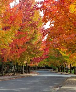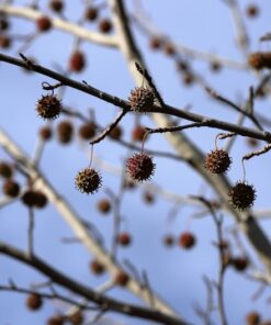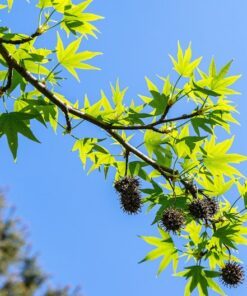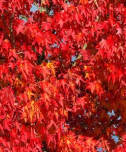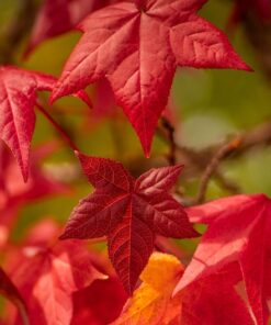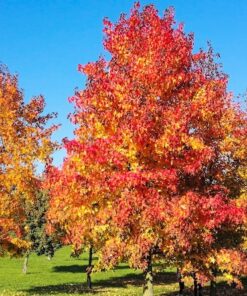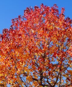 The American Sweetgum (Liquidambar Styraciflua) is a remarkable tree known for its stunning fall colors. The star-shaped leaves transform into vibrant shades of red, yellow, orange, and purple, creating a breathtaking display. These trees not only beautify your landscape but also provide unique decorative seed pods.
