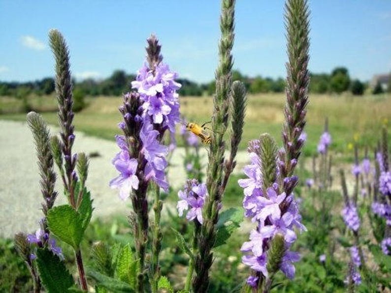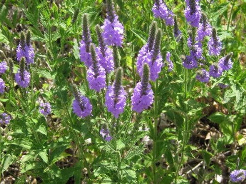 The Hoary Vervain, or Verbena Stricta, is a beautiful purple flowering plant that can reach heights of 24 to 36 inches. These seeds are perfect for gardeners looking to attract butterflies to their gardens.