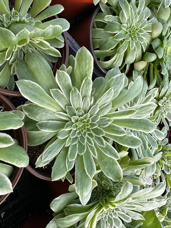 Aeonium Emerald Ice features a rosette formation of vibrant green leaves edged with a creamy white margin. This attractive contrast enhances its overall appeal. The plant is a slow grower, typically reaching around 20 inches in height and 12 inches in width, making it a great addition to any space.
