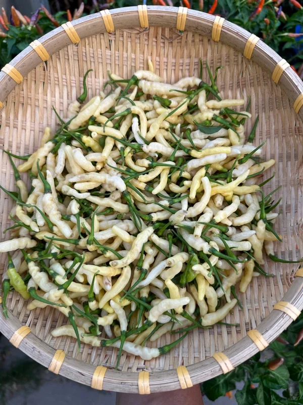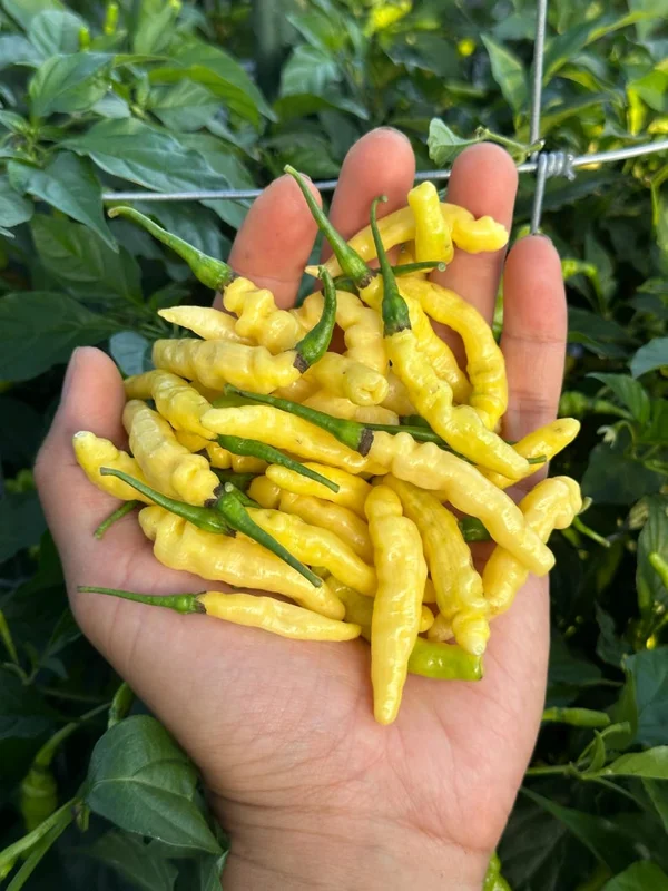 This beautiful plant grows to approximately 60 cm in a pot, forming an attractive umbrella shape. You’ll be amazed by the abundant yields, with each plant producing hundreds of pods. The pods themselves are about 4-5 cm long and 1 cm wide, featuring wrinkles that give them a caterpillar-like appearance. The Aribibi Gusano peppers transition through a stunning color transformation, starting light green, then creamy white, and finally maturing to white.