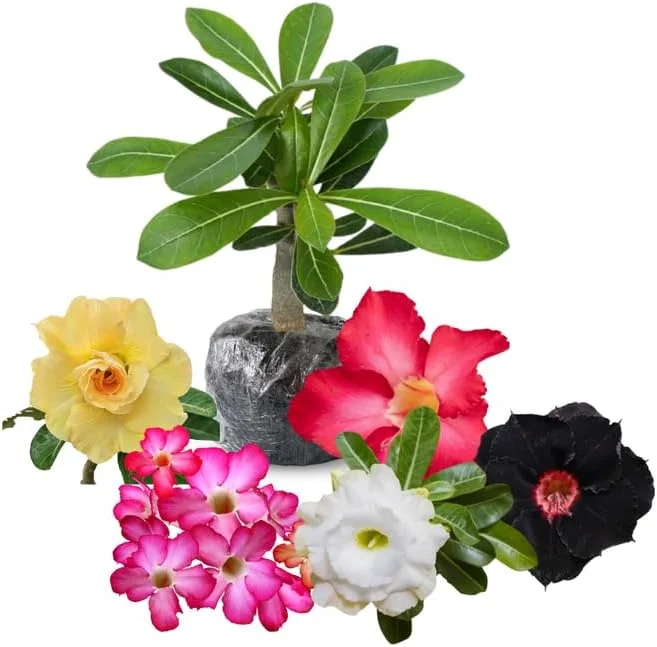 - Q: What kind of blooms can I expect from this desert rose plant for sale? A: This pack offers plants with assorted vibrant blooms, meaning you can expect a variety of colors, typically including shades of pink, red, and white, adding a beautiful surprise to your collection.