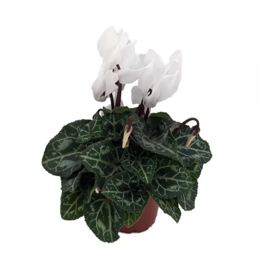 The White Persian Violet – Cyclamen – House Plant is a stunning addition to your indoor decor. This miniature Cyclamen is known for its beautiful white flowers and attractive heart-shaped foliage. Originating from the Mediterranean, it thrives in bright, cool environments, making it perfect for homes and offices.