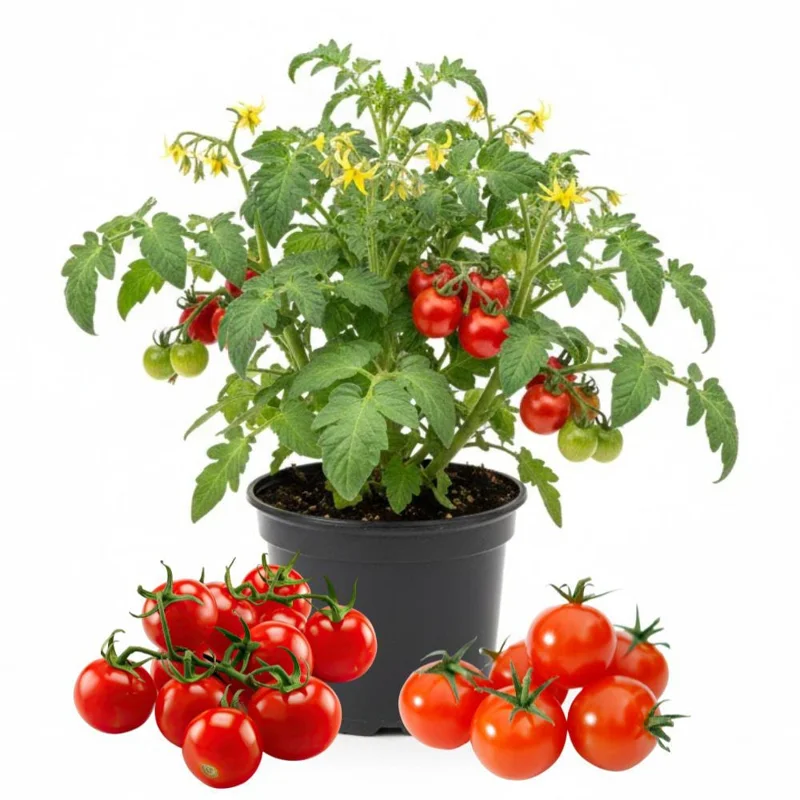 Cherry Tomato is a popular variety known for its small, round fruit with a sweet, tangy flavor. Perfect for snacking, salads, or garnishes, this plant thrives in sunny environments and is ideal for growing in home gardens, containers, or hanging baskets. It's a great choice for gardeners looking to grow their own fresh, bite-sized tomatoes.