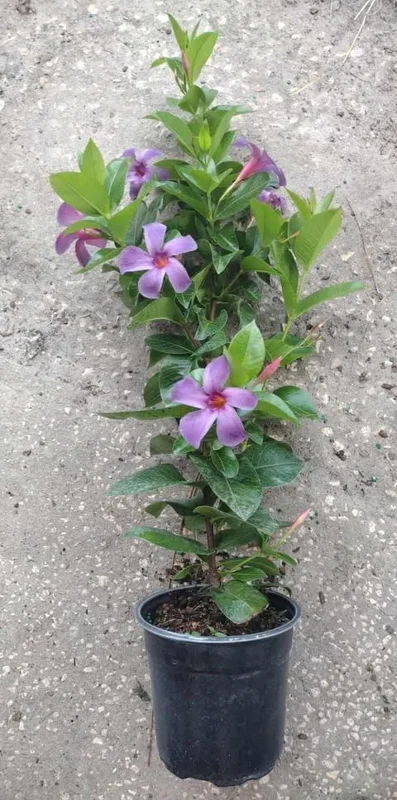 This offering is for one healthy purple mandevilla live plant, which typically arrives standing 10 to 12 inches tall from the base of the plant to the top of its foliage. These vigorous vines are known for their rapid growth once established, with the potential to reach heights of 6 to 10 feet or more when provided with adequate support like a trellis or arbor. The plant is shipped in a nursery pot, ensuring its root system is well-protected and ready for transplanting into your desired container or garden bed. Expect a robust root ball and healthy, glossy green foliage, often with developing flower buds or existing blooms upon arrival.