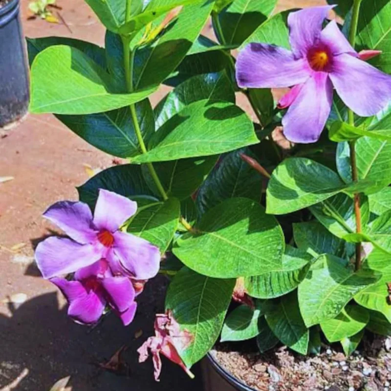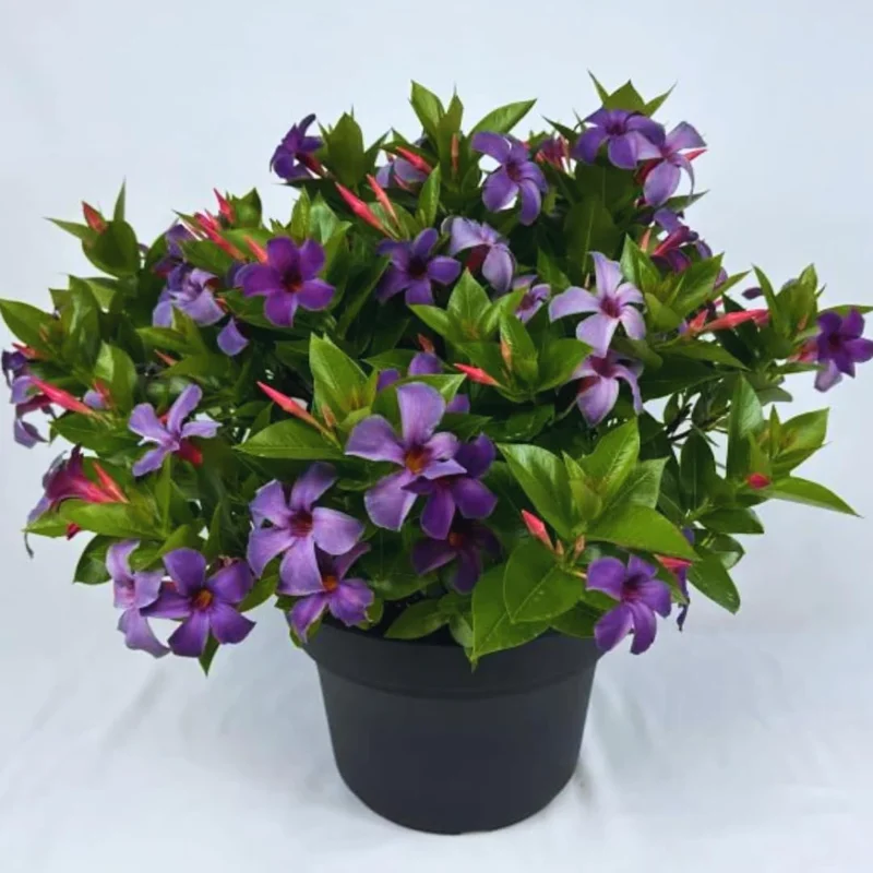 The Mandevilla (often incorrectly called Dipladenia, which is a closely related but distinct genus) is a genus of tropical and subtropical flowering vines belonging to the dogbane family, Apocynaceae. Known for their showy, funnel-shaped flowers and glossy green foliage, these plants are native to the Southwestern United States, Mexico, Central America, the West Indies, and South America. Our purple mandevilla live plant is carefully cultivated to ensure robust growth and prolific blooming, offering you an instant garden upgrade with minimal effort. Whether you’re an experienced gardener or just starting, this plant promises to deliver breathtaking beauty and a touch of the tropics to your home.