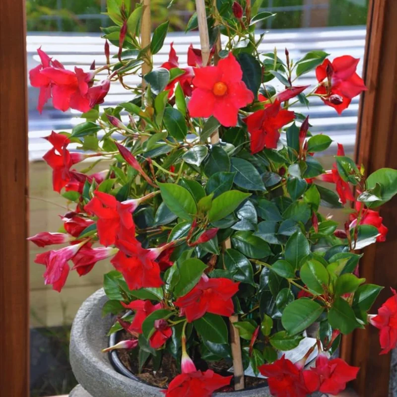 - Vibrant, Long-Lasting Blooms: Mandevilla plants are renowned for their continuous display of large, trumpet-shaped red flowers that bloom from spring until the first frost, providing extended periods of color in your garden.