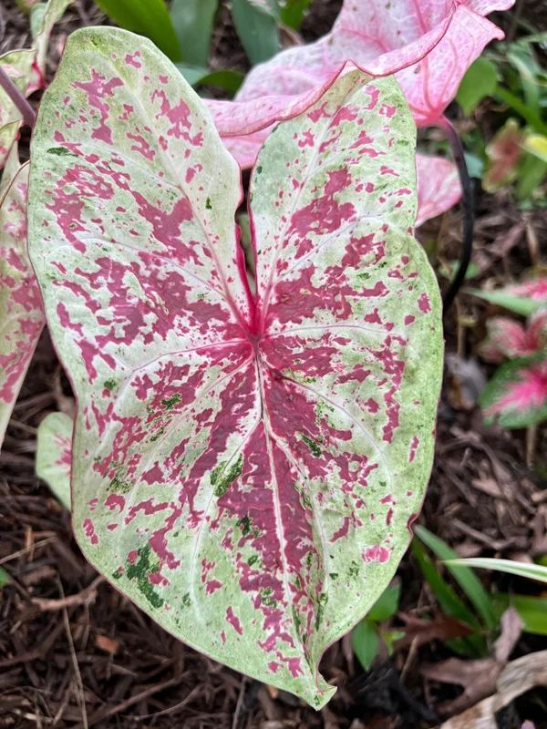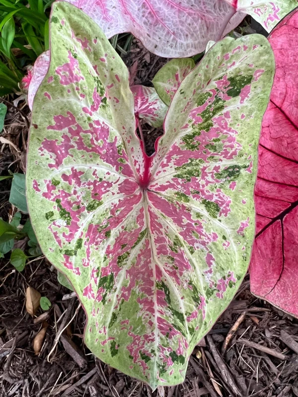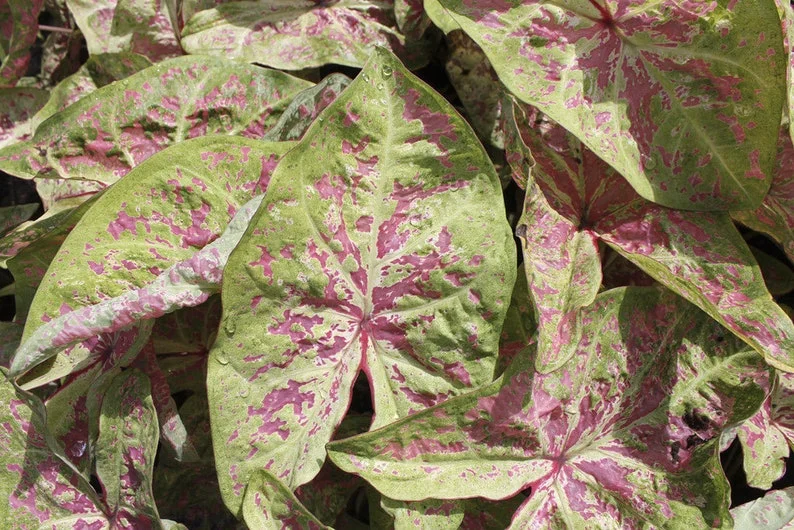 Add a touch of elegance and vibrancy to your garden or home with the Seafoam Pink Caladium (2 Bulbs). This unique variety features light green-yellow leaves variegated with shades of pink, white, and green, creating a stunning visual effect. The white veins add a delicate detail, making this plant truly stand out.
